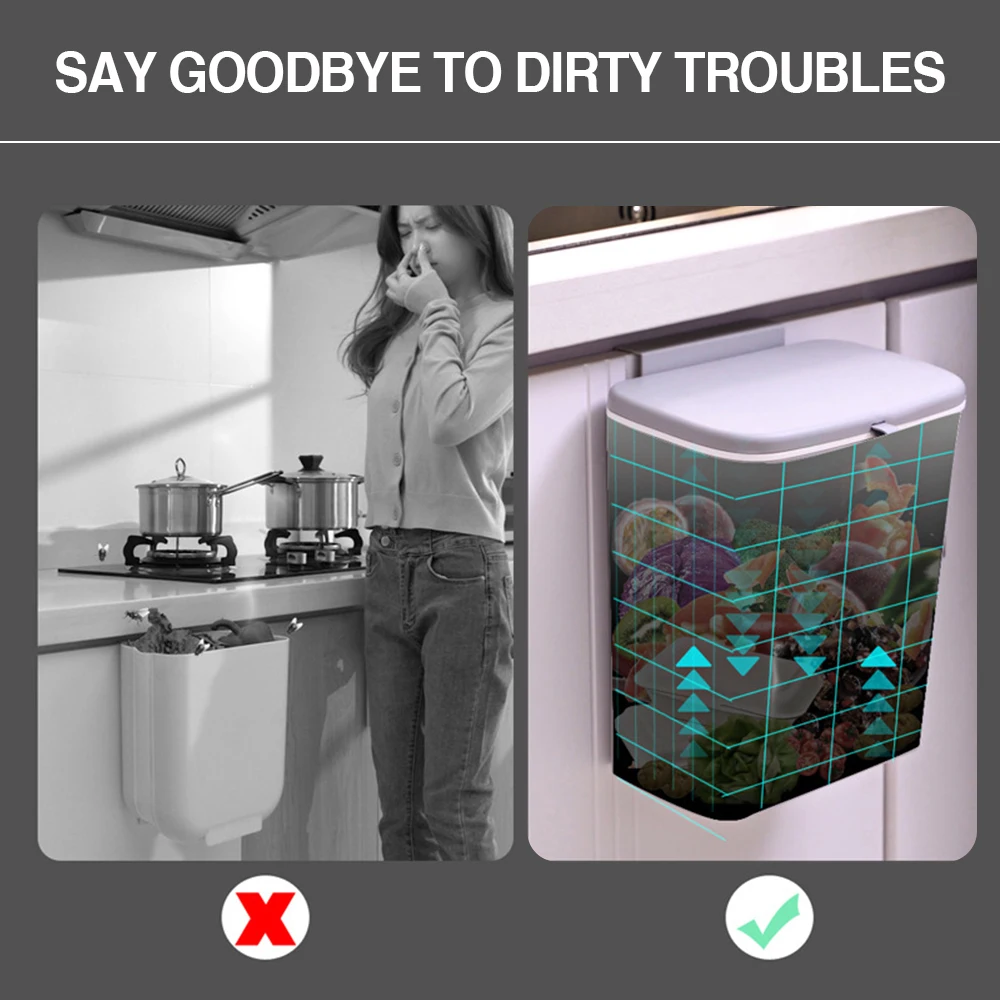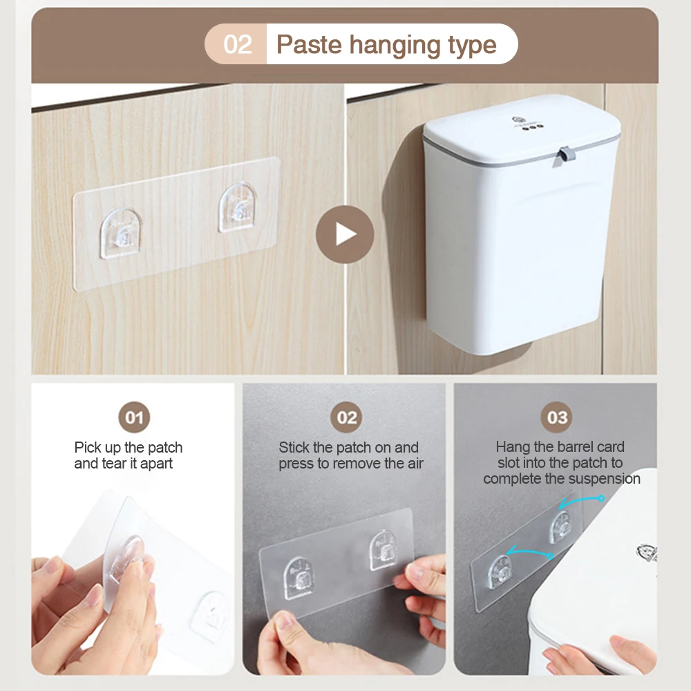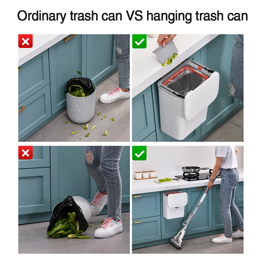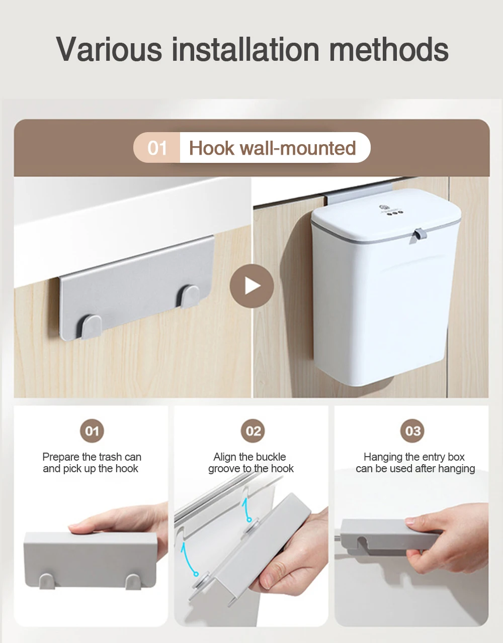 1. Hanging Design: wall paste hanging and door-mounted hook, No need to bend, throw garbage easily. It's a space-saving and environmentally friendly garbage can. 7L/9L capacity.