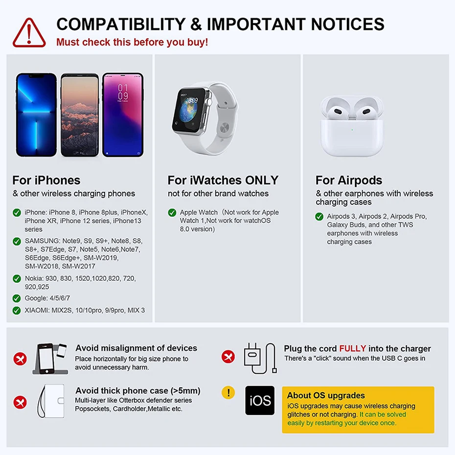 5. COMPATIBILITY IMPROVEMENT: Available for iOS and Android devices, 3 in 1 charging station for iPhone 14/14 Plus/14 Pro/14 Pro max/13 Mini/13/13 Pro/13 Pro Max/12 Mini/12/12 Pro/12 Pro Max/11/11 Pro/11 Pro Max/XS/XS Max/XR/X/8/8P, AirPods Pro 2/Pro/3/2, iWatch Ultra/SE/8/7/6/5/4/3/2.