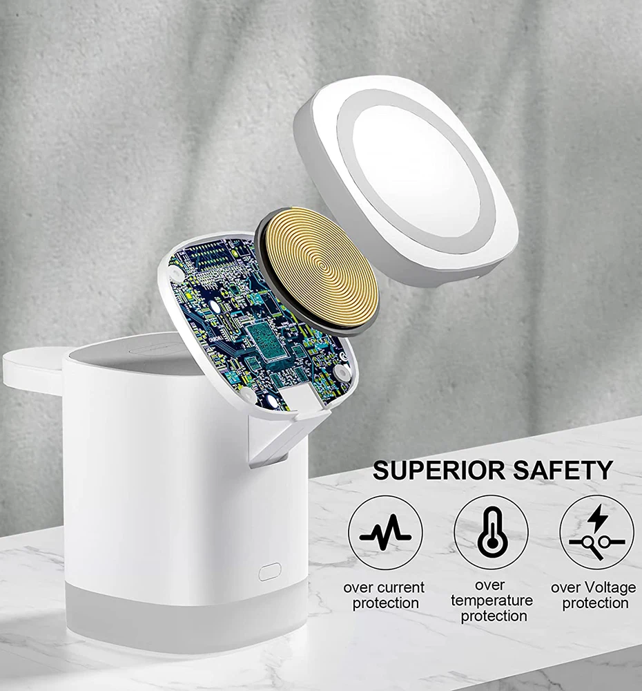 4. SMART BREATHING LIGHT: Magnetic wireless charger comes with a smart indicator light that glows in different colors when charging. When the mobile phone is charging, it shows blue light, when the earphone is charging, it shows a green light. when charging at the same time, it shows alternating blue-green breathing lights. You can manually turn on/off the smart breathing light function.
